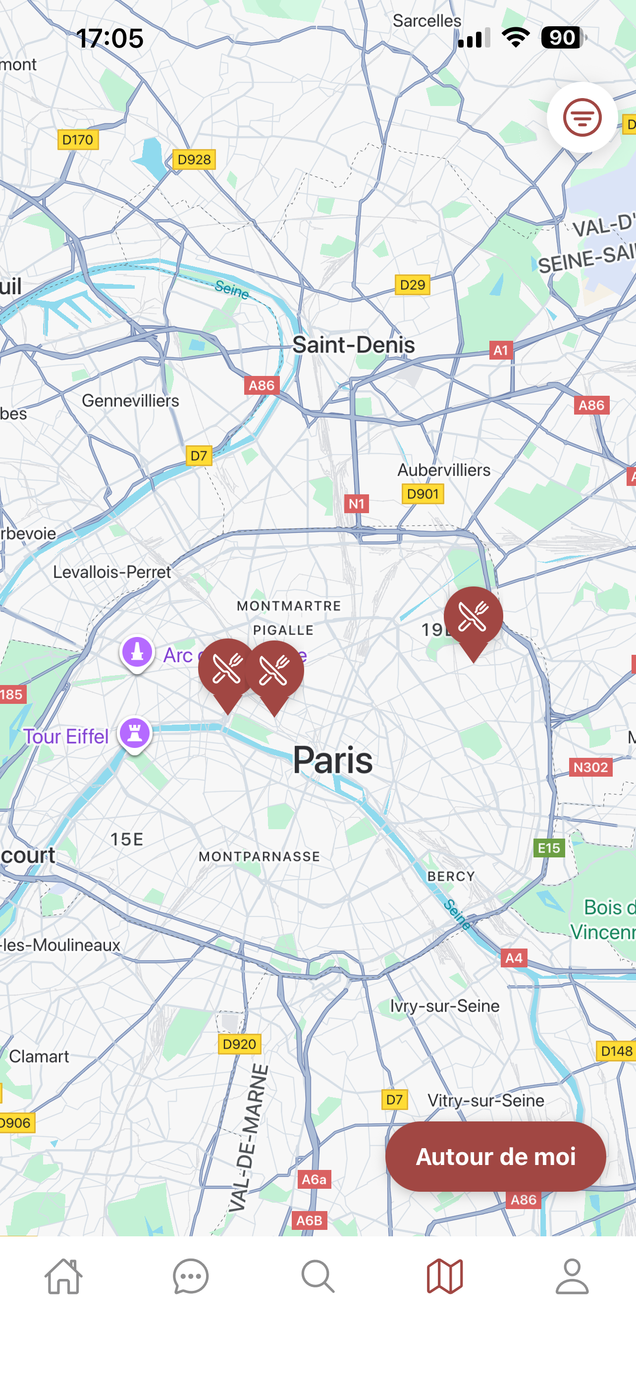 Carte interactive géolocalisée limitée à l'Île-de-France avec recentrage automatique. Filtre "Autour de moi" (rayon 2km) et filtres par type de cuisine.
